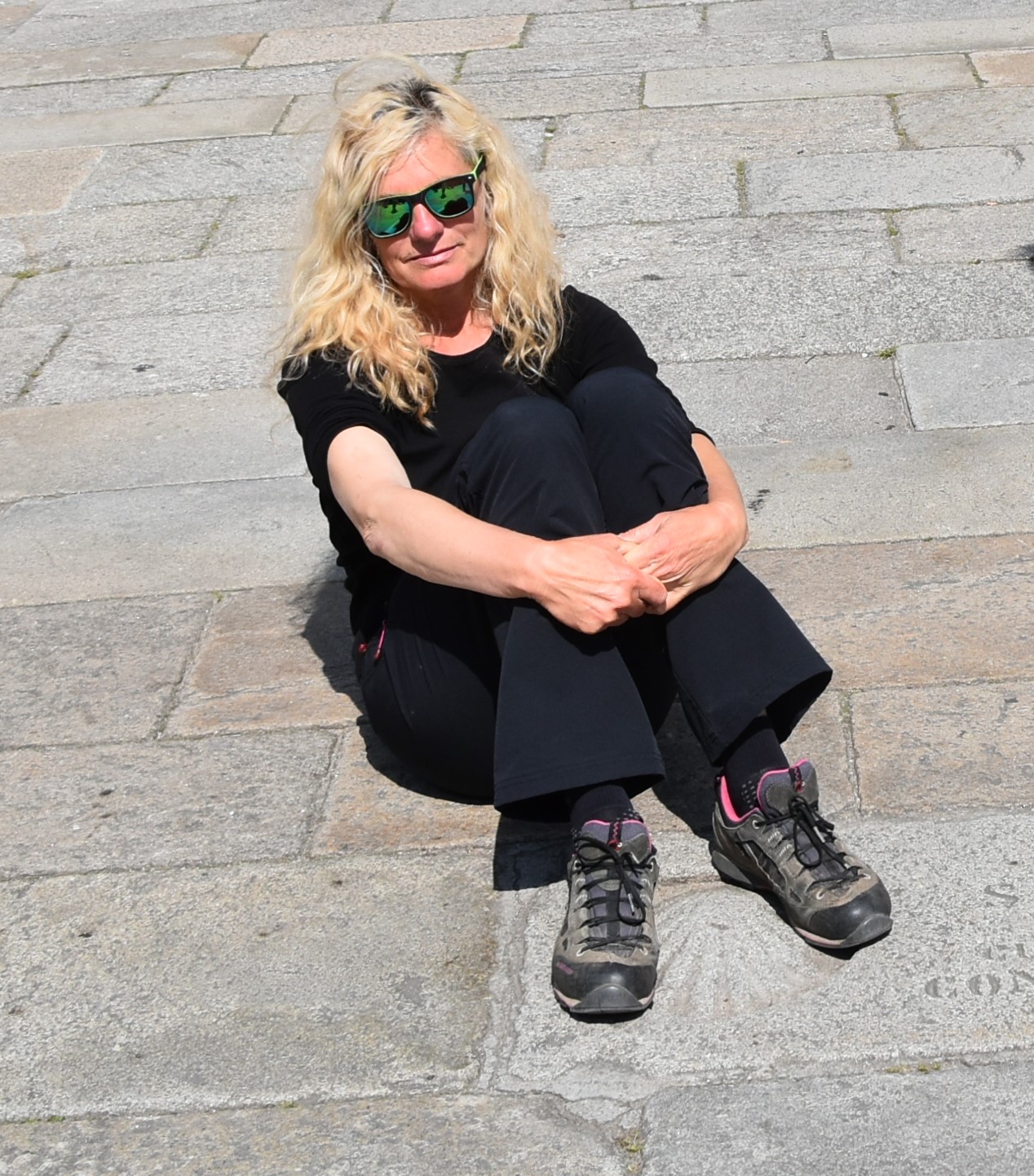 Z nogami na Jakobovi školjki pred katedralo v Santiagu