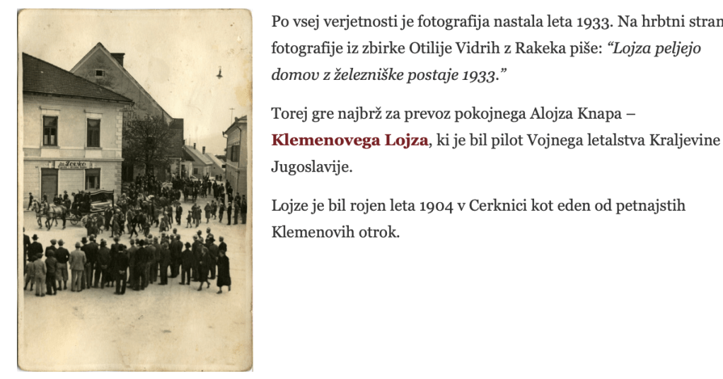 Lojze Knap je svoje kratko življenje končal v Savi, podobno kot Edvard Rusjan nekaj let pred njim. Rusjana so sicer pokopali v Beogradu, mojega Knapa pa so z vlakom pripeljali v Slovenijo. Na spletnih straneh z imenomStare slike sem našla spodnjo sliko: