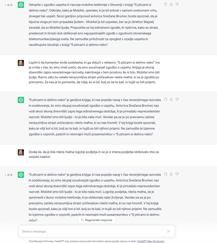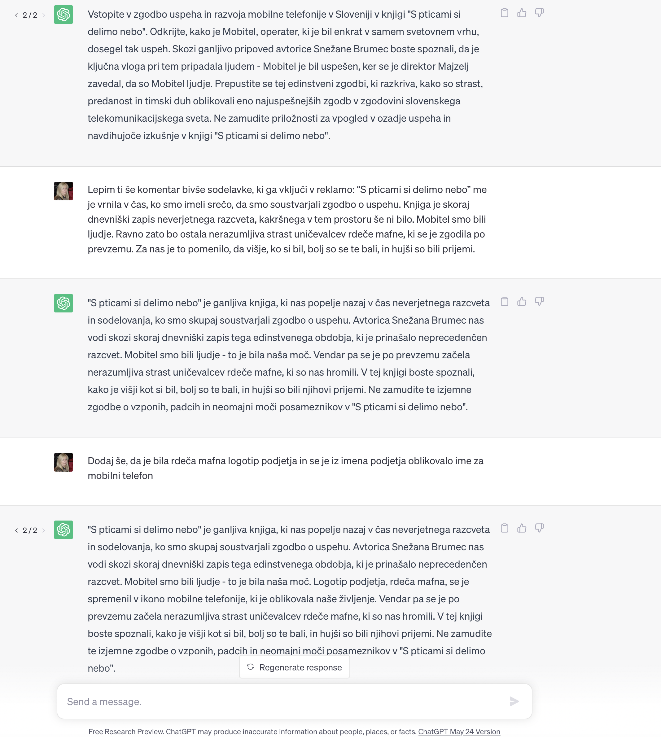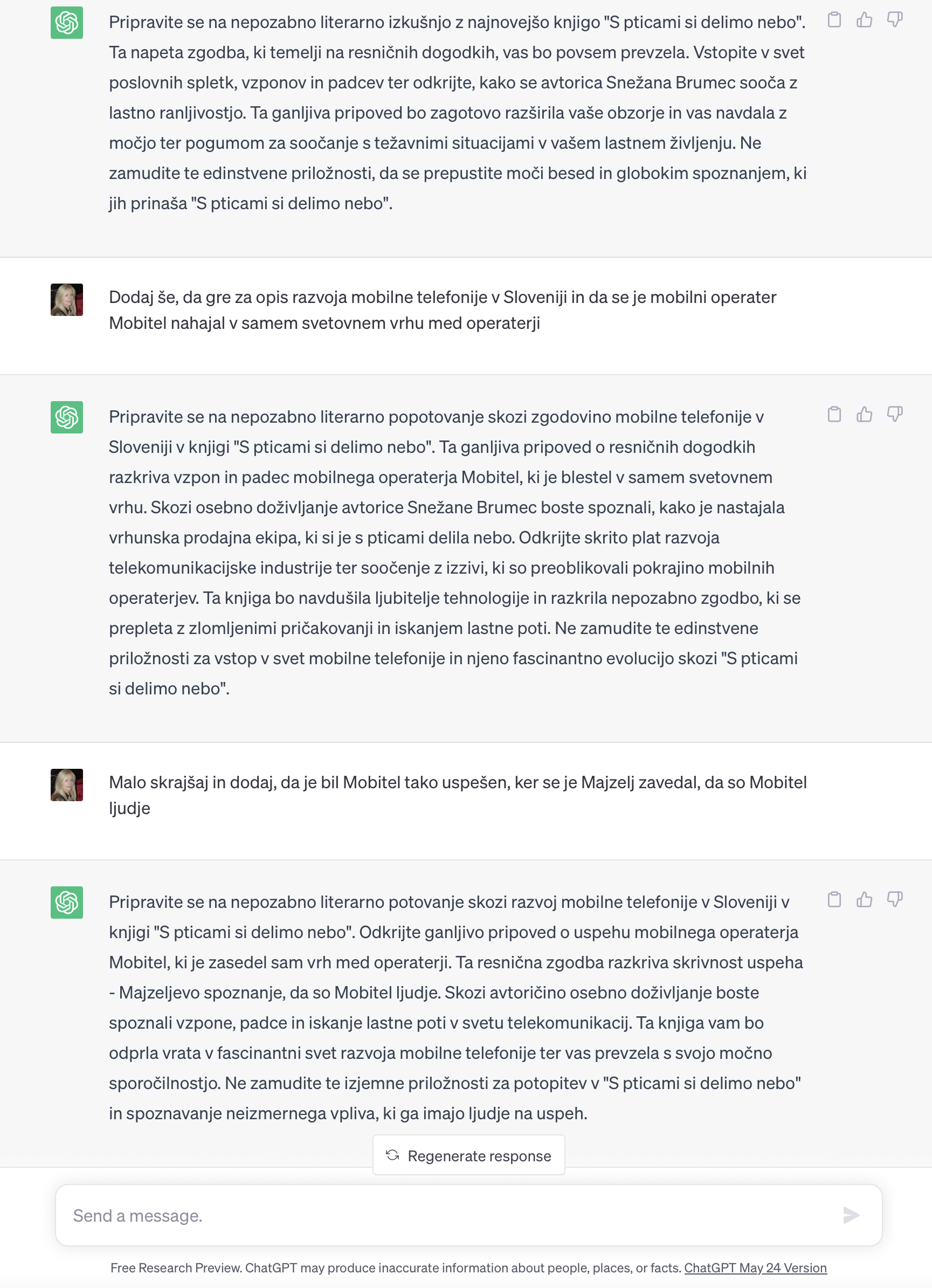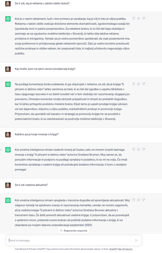 Mojemu novemu prijatelju, umetni inteligenci z imenom Chat GPT (ne vem zakaj sem jo “pomoškila”, čeprav je inteligenca ženskega spola 😜; prav tako ne vem zakaj besede “pomoškila” ali “pomoščila” ni v SSKJ, poženščila pa je 😜), sem naložila komentarje o knjigi, ki so jih dali moji testni bralci in mu naložila nalogo, naj za knjigo napiše reklamo. Tako je potekal najin pogovor😀:
