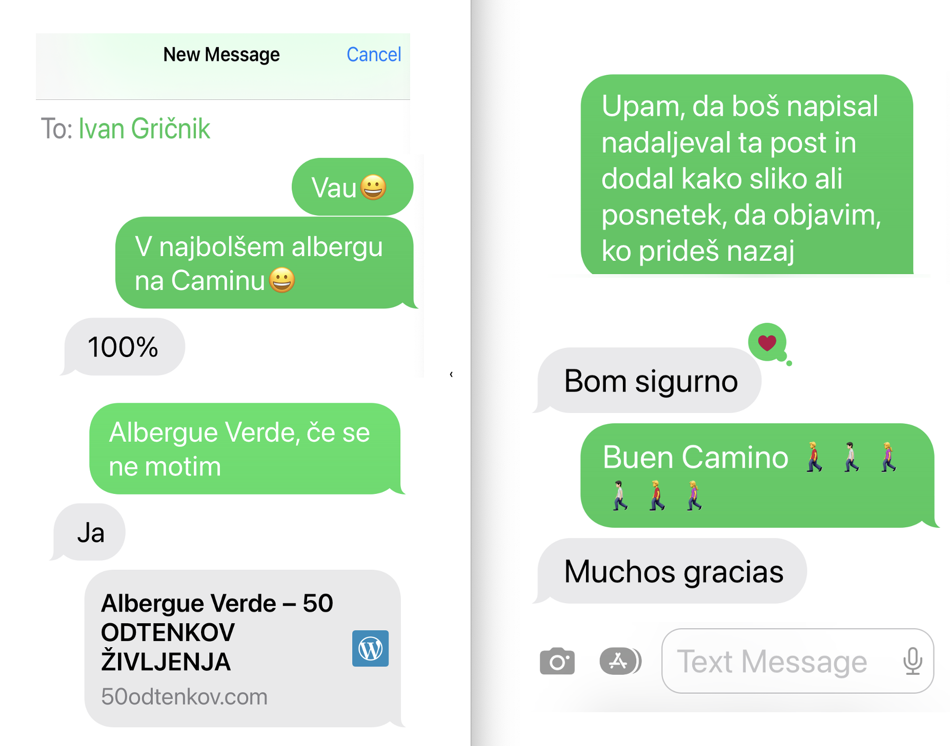 Ko sem tudi sama prehodila Camino v letu 2016 sva se seznanila in o Caminu, najini novi ljubezni, večkrat živahno in z nostalgijo diskutirala – tudi o albergu Verde. “Naključje” (narekovaje sem zapisala, ker tisti, ki smo prehodili Camino namreč vemo, da naključij ni) je hotelo, da sem tudi sama (med stotinami albergov, ki na Caminu so), prenočevala v njem. Ko sem v letu 2019 ponovno hodila po teh poteh, sem, takrat načrtovano, ponovno prespala v tem, za naju z Ivanom najboljšim albergom. O njem si lahko preberete kaj več tudi na tej povezavi: NAJBOLJŠI “ALBERG” NA CAMINU?