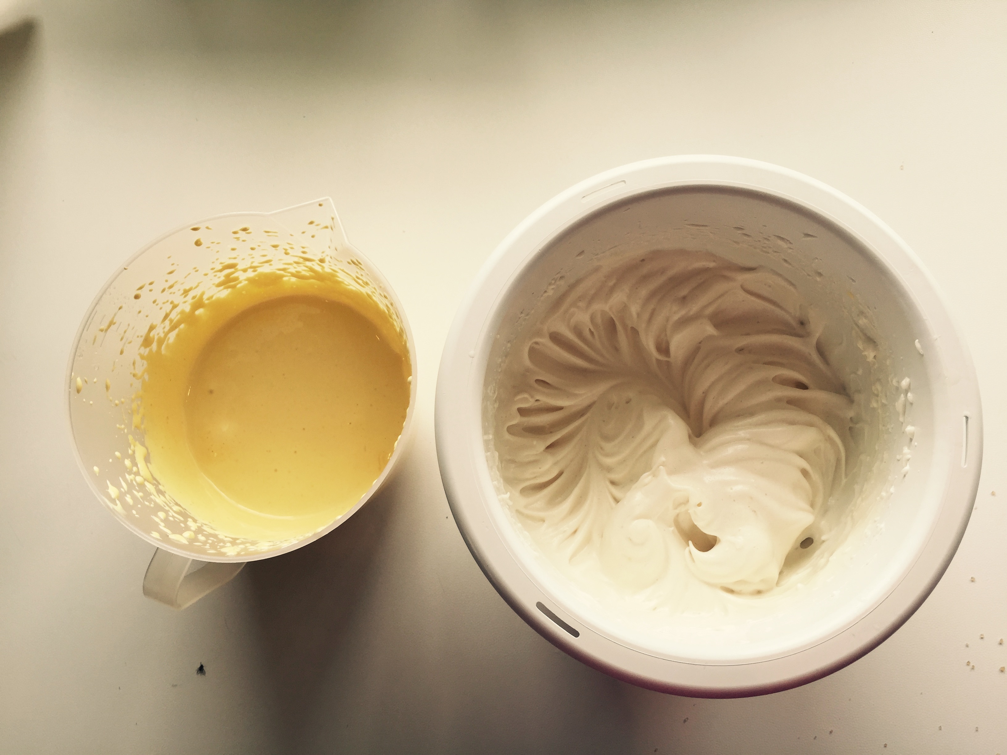 Medtem ko pečemo jabolka, pripravimo biskvit. Najprej ločimo beljake od rumenjakov. Tri žlice sladkorja dodamo v beljake in tri žlice k rumenjakom. Iz beljakov stepemo sneg, nato rumenjake s sladkorjem stepamo tako dolgo, da zmes naraste, postane penasta in bledo rumena. Nato odložimo mešalnik in vzamemo lopatko.