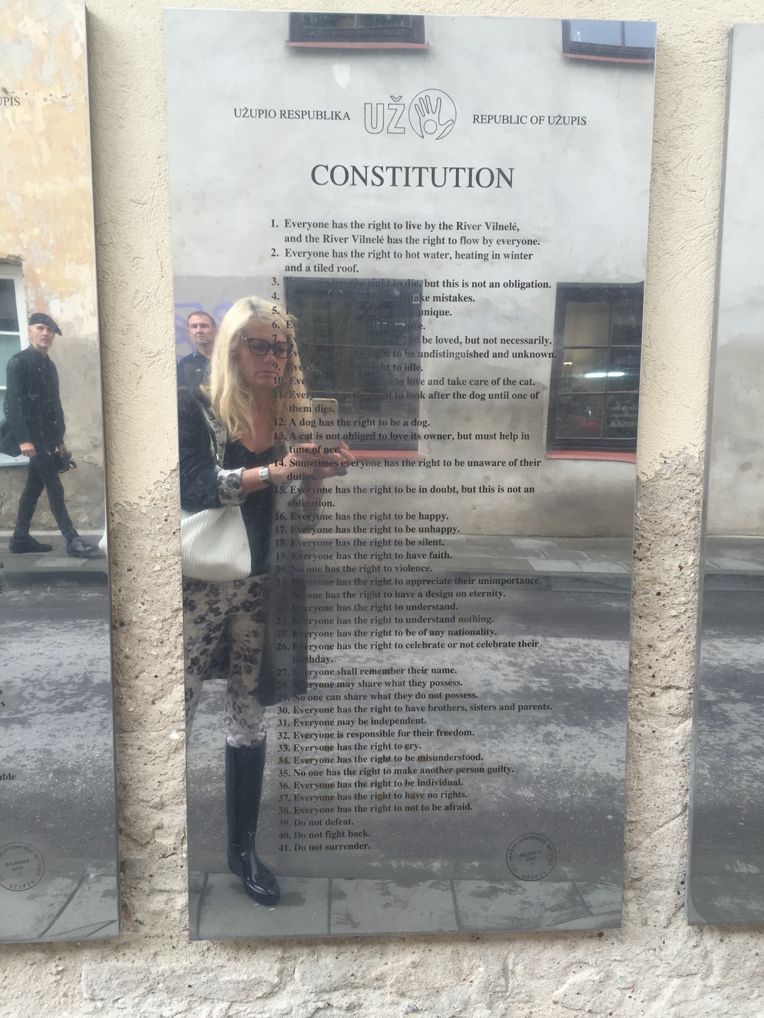 Po moji oceni je to najbolj liberalna ustava na svetu, saj daje v skladu z 12. in 13. členom določene pravice tudi psom (vsak pes ima pravico biti pes) in mačkam (mačka ni dolžna imeti rada svojega gospodarja). 🙂Užupis - 1