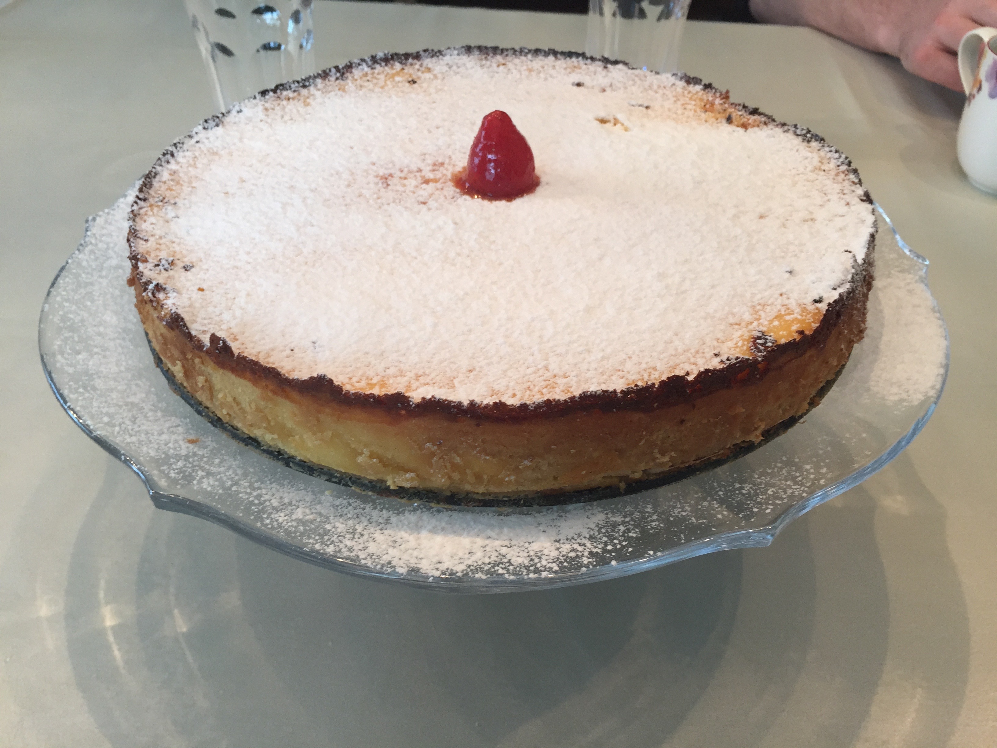* Količine originalnega recepta sem iz “ameriških” merskih enot vestno pretvorila v merske enote, ki jih za peko običajno uporabljamo v Sloveniji. Malo sem zaokrožila, da so se količine lepo izšle in se pri pripravi striktno držala količin. Vendar je bilo nastalo testo premehko za valjanje, zato sem ga enostavno namazala z lopatko na obod. Precej časa sem porabila, da je nastala testena posoda in vse skupaj je bilo bolj podobno pacanju, zato testenega oboda ne delam več, ampak celotno testo uporabim za tortno dno. Enostavno ga z lopatko razmažem po peki papirju.