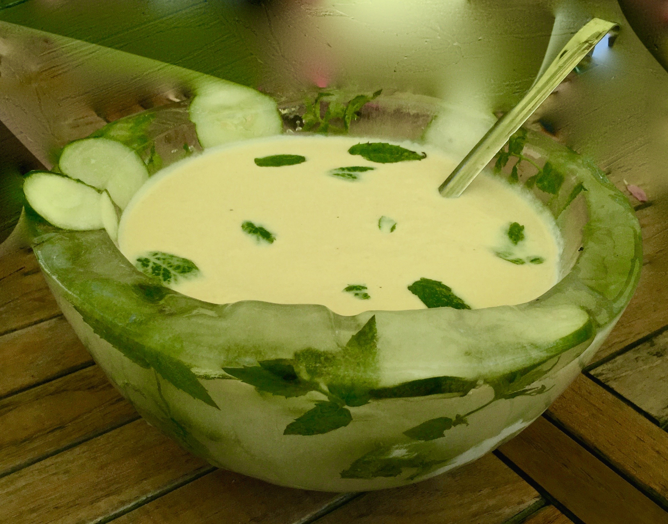 In moj hit letošnjega poletja je bila ledena posoda. Lepa na pogled, zelo poceni, ker vanjo vložite samo nekaj dela, praktična, ker jo ni treba pomivati, z dodano vrednostjo, ker jed krasi in jo hladi. Izdelujem večjo, ki jo uporabljam za hladno kumarično ali bučkino juho in manjšo v kateri serviram sadne solate. Navodila za izdelavo sem zapisala tule.