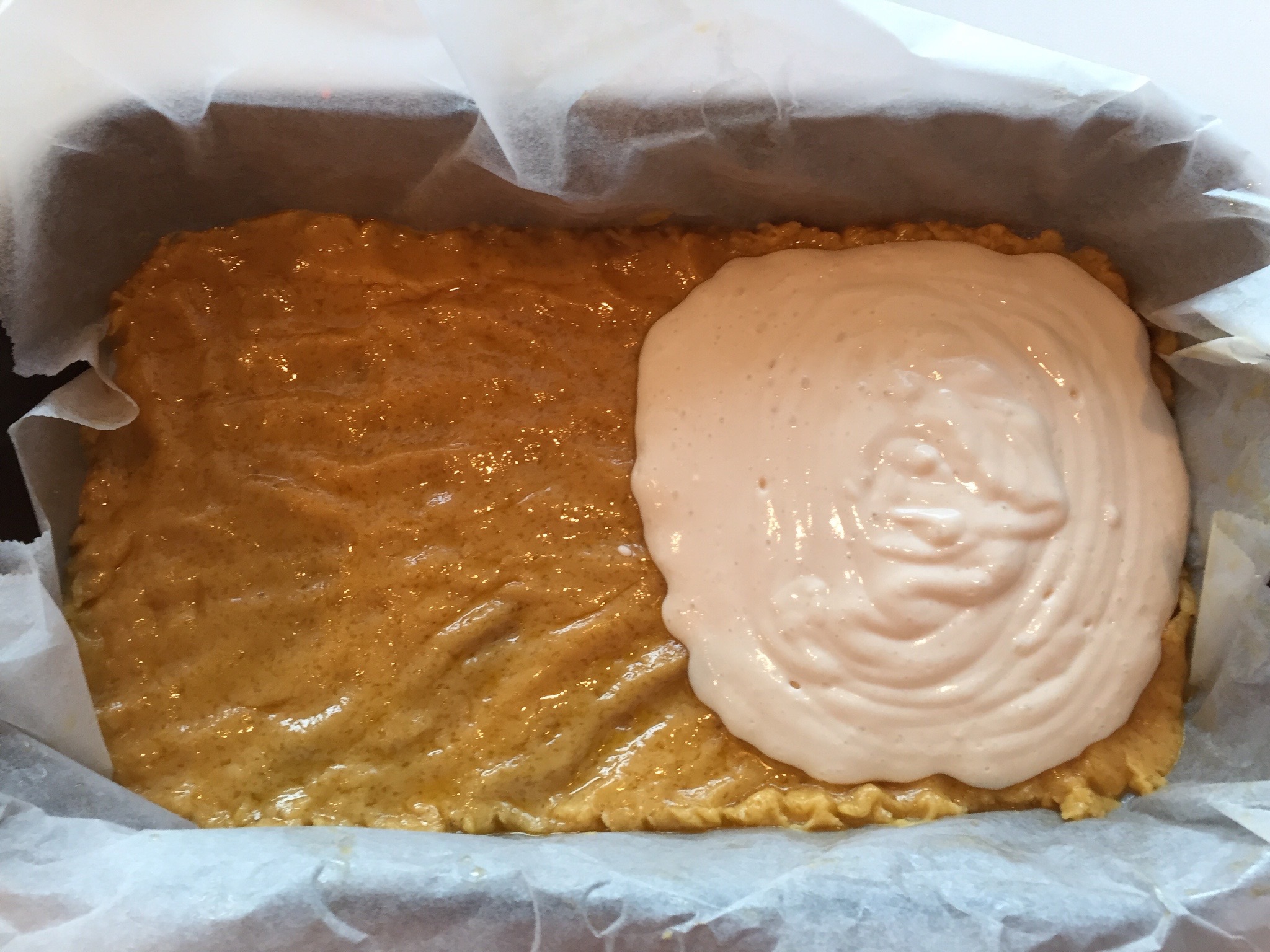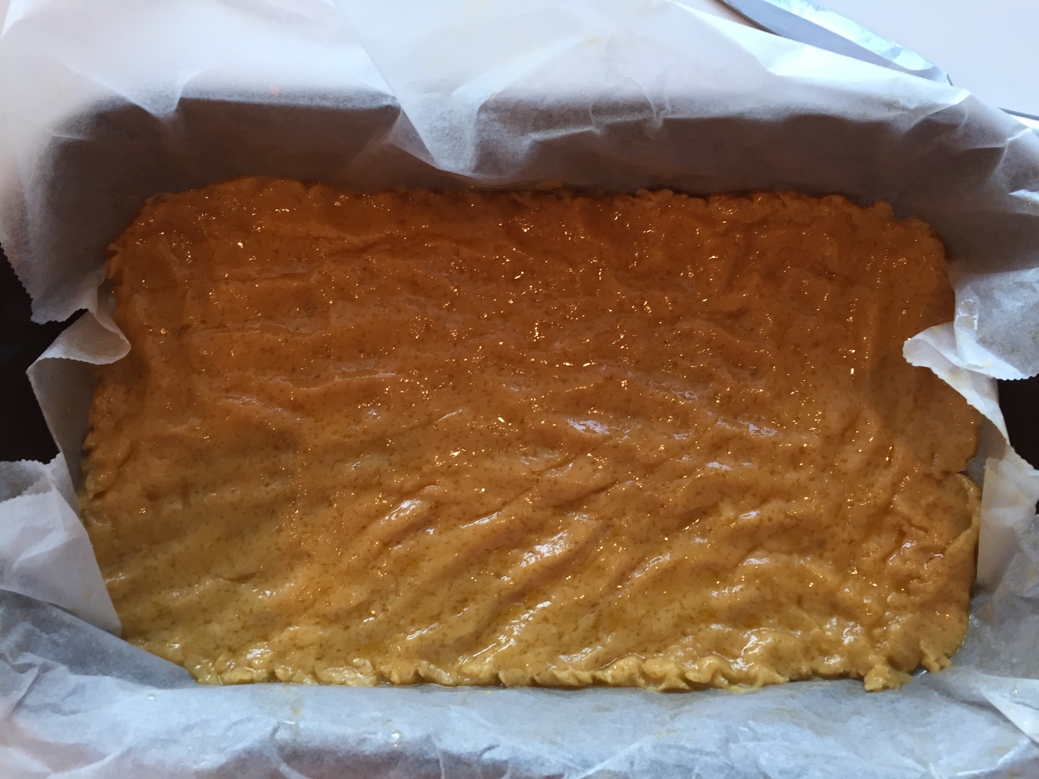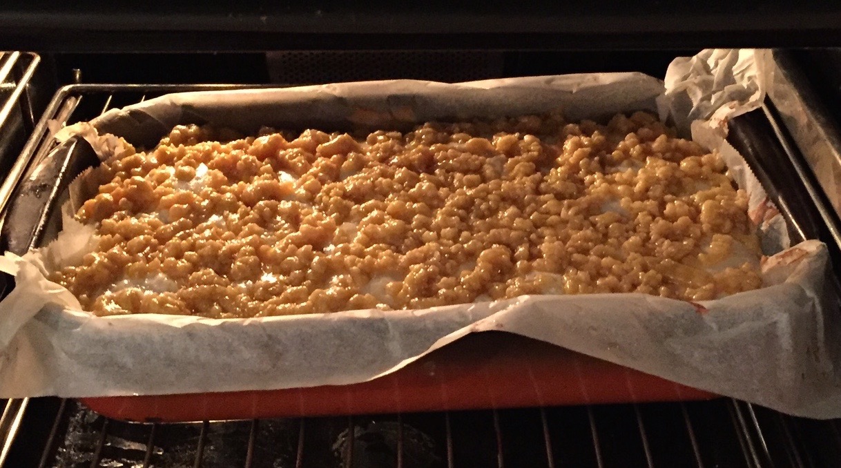 Pečico prižgemo na 180 stopinj Celzija. Pekač obložimo s peki papirjem. 2/3 testa s prsti razporedimo po dnu pekača. Preostalo tretjino damo v hladilnik, da se malo strdi.