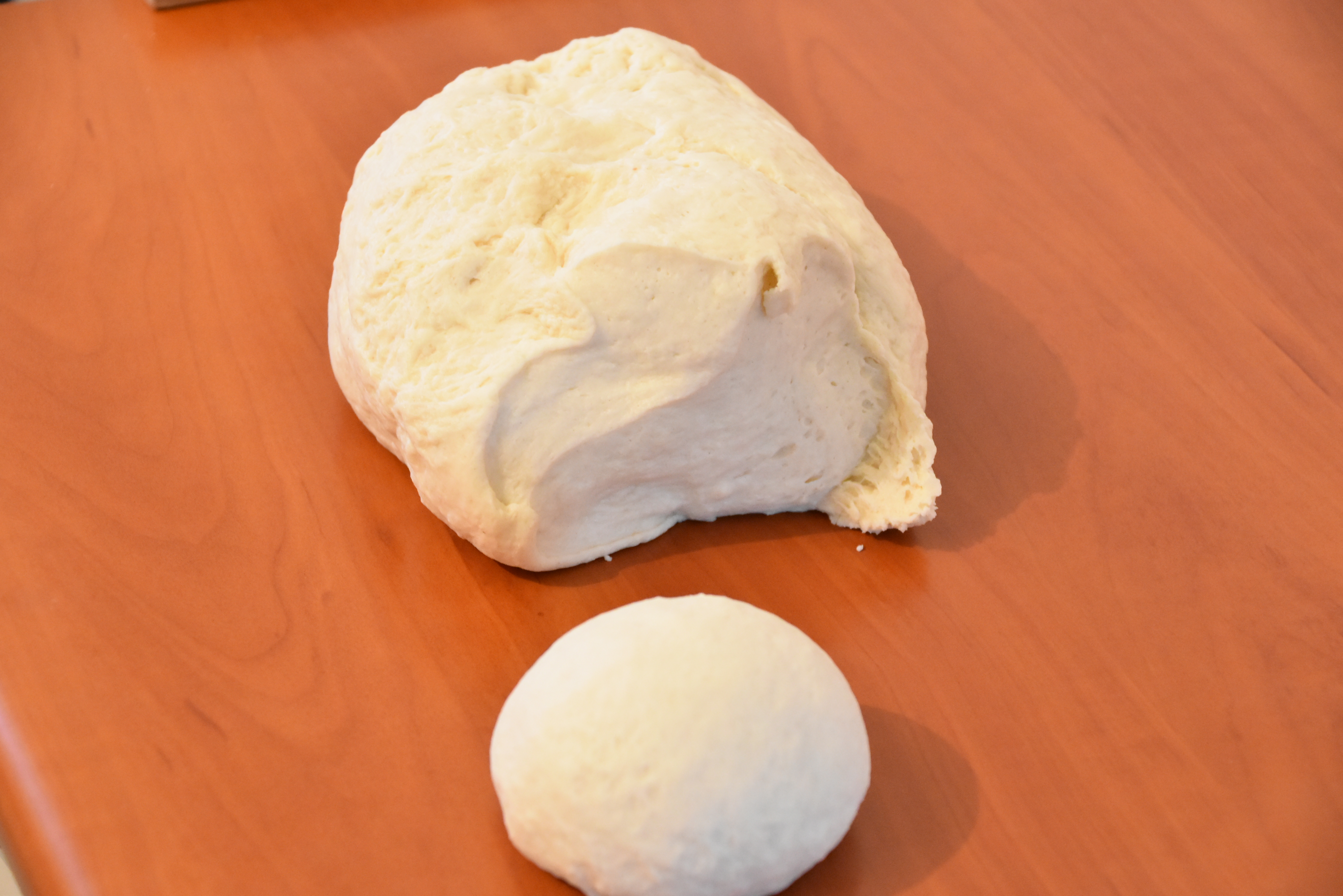 5. S konicami prstov oblikujte krog. Ko je testo dvakrat vzhajalo, namokajte delovno površino in nanjo položite eno kroglico testa.