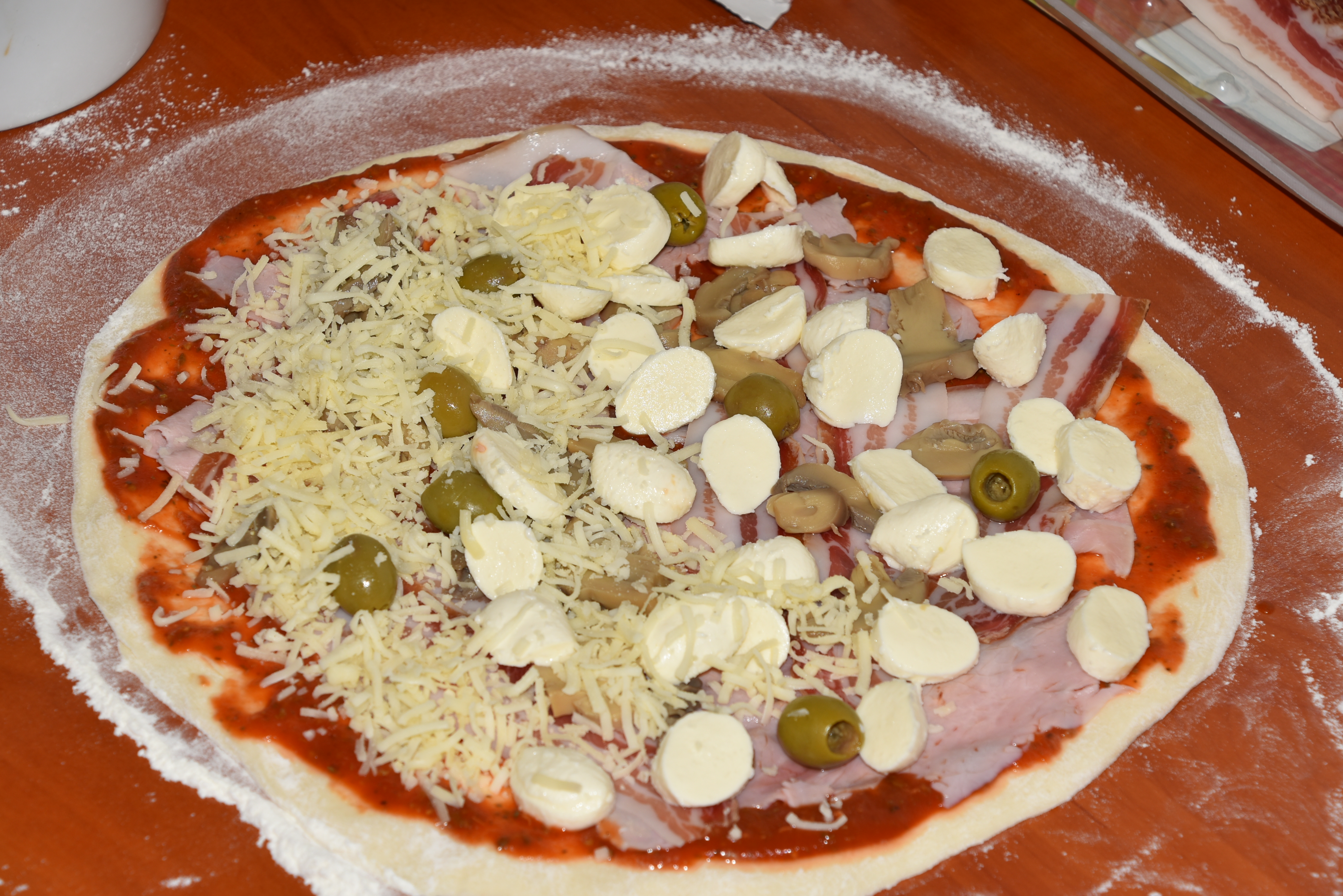 Obložite jo s kuhanim pršutom, pečenim pršutom, panceto, suho salamo, olivami, gobicami, razno zelenjavo.