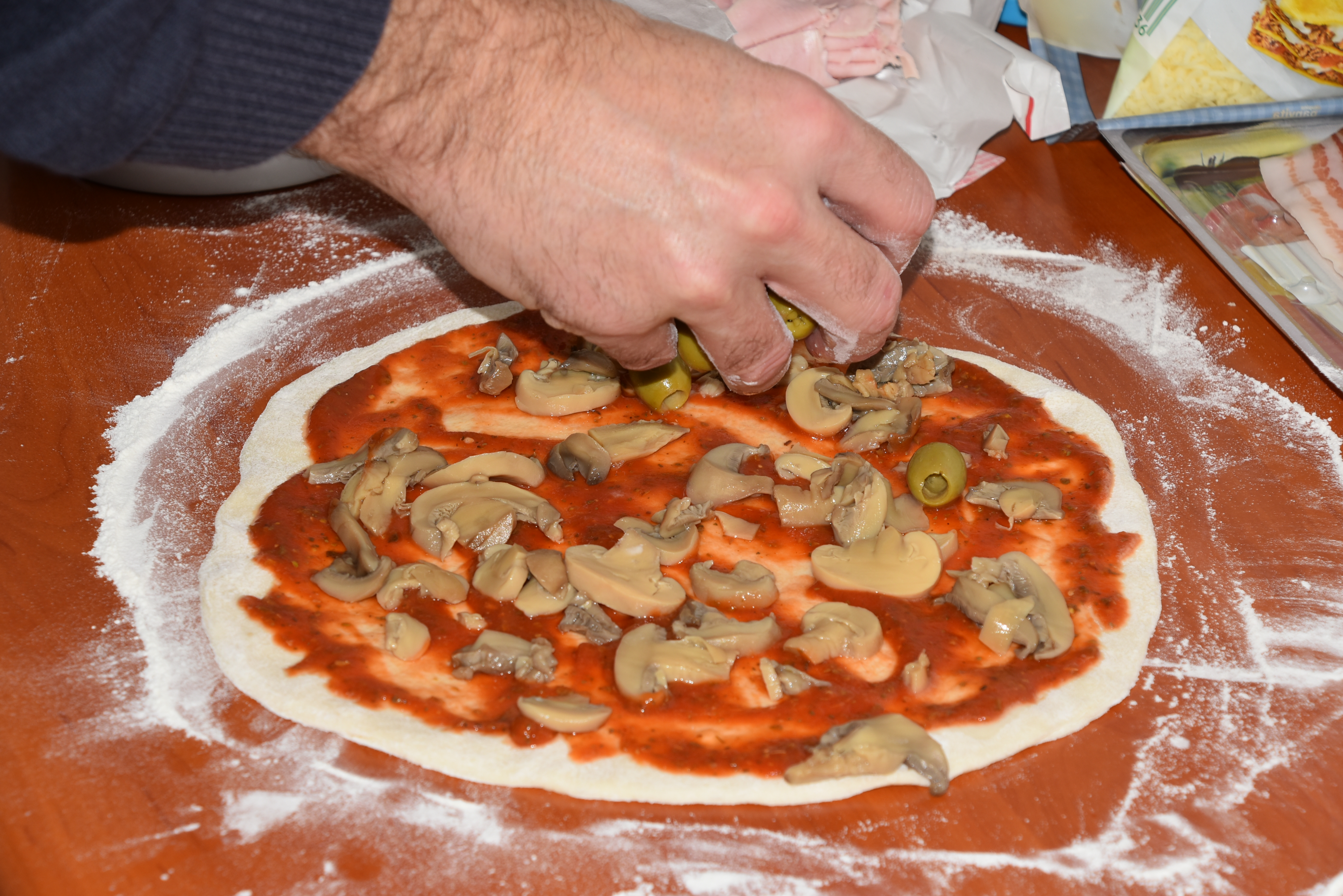 Potlačite kroglico testa, da dobite kolobar in s konicami prstov testo obračajte in raztegujte hkrati. Oblikujte krog s premerom 30 cm.