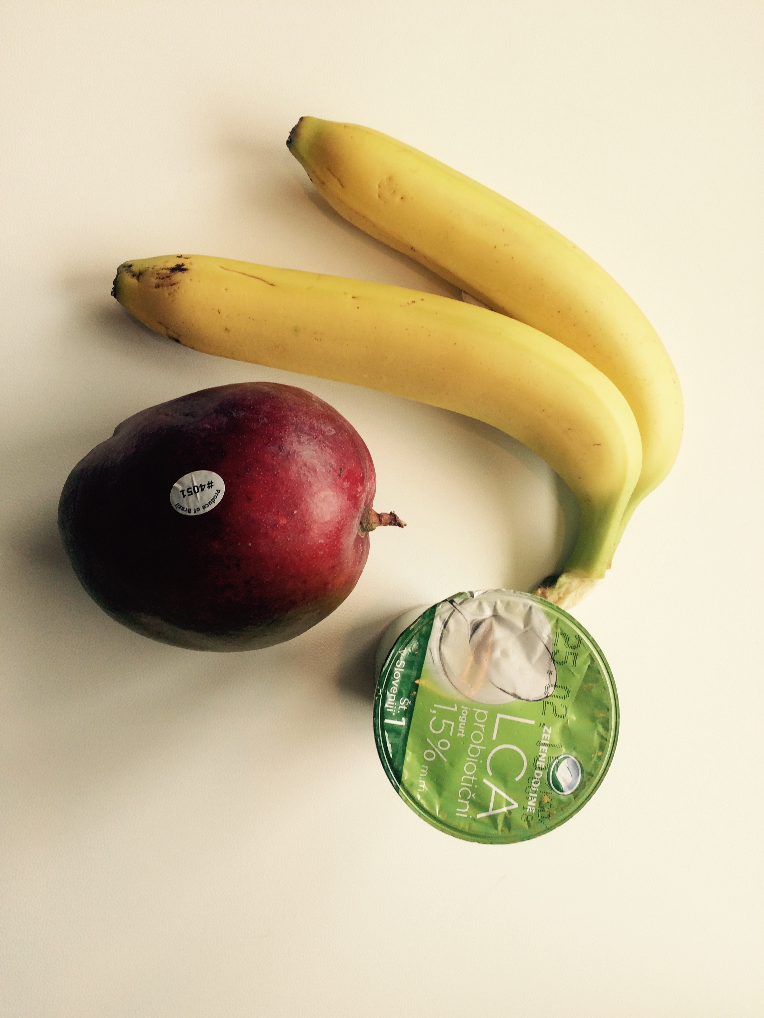 1. Zrel mango olupite, odstranite koščico in narežete na večje kose. Banani olupite in narežete na daljše kolobarje.