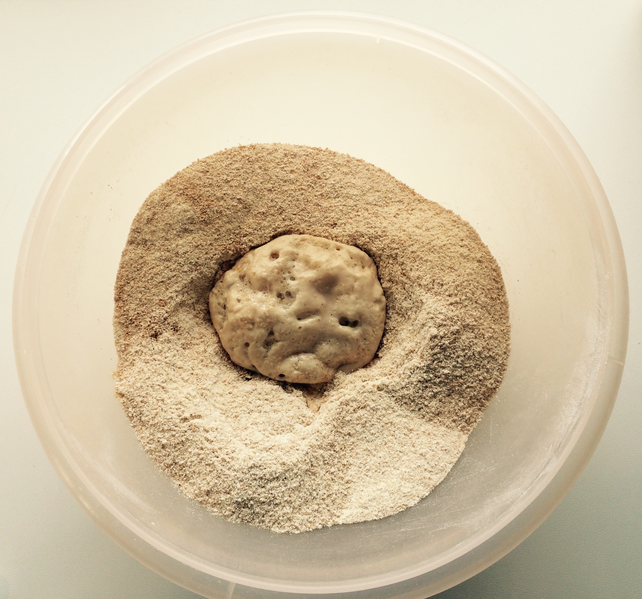 V plastično posodo vsujemo polnozrnato moko. V glavnem uporabljam sveže zmleto polnozrnato moko: vzamem 800 g bio pšenice in jo zmeljem v mlinčku za žito ampak v redu bo tudi že mleta kupljena. V moko skopljemo luknjo in vanjo nadrobimo kvas. Kvas posujemo s čajno žličko sladkorja in zalijemo s precej toplim, a ne prevročim mlekom. Pustimo, da kvas vzhaja dokler ne dobimo takšnega kupčka.