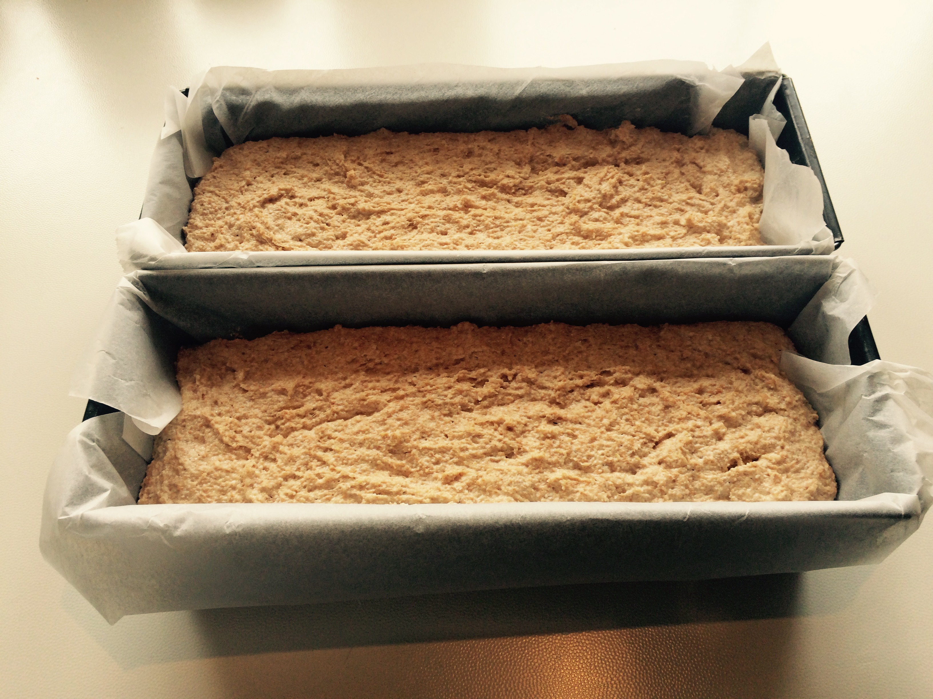 Medtem zmešamo vročo vodo z jogurtom in zravnano čajno žličko soli. Po želji dodamo olje in nasekljane orehe. S kuhalnico zmešamo zmes z moko in pustimo na toplem vzhajati kakšno uro. Pripravimo model za peko in ga obložimo s peki papirjem. Za peko uporabljam dva visoka modela za peko mesnih štruc. Obložim ju s peki papirjem, razdelim vzhajano testo v oba pekača in ponovno pustim testo, da vzhaja kakšne pol ure, dokler ne naraste skoraj do roba pekača.
