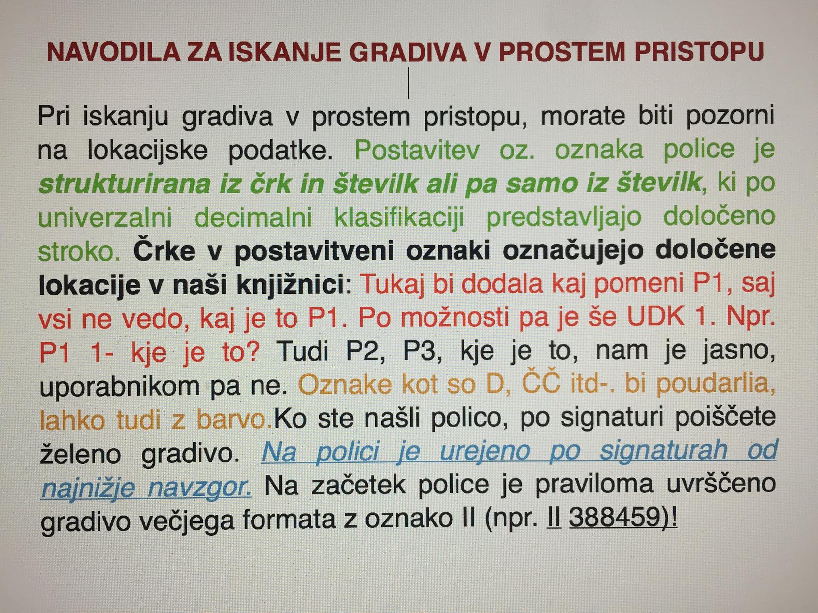 Po nekaj letih sem zdaj ponovno stala pred velikim izzivom (ne smem reči problemom, ker imajo v naši pozitivno usmerjeni dobi, probleme samo negativneži). Mašo sem morala prepričati, da mi bo šla po knjige, čeprav se nahajajo v prostem pristopu. Vedela sem, da je to dokaj trd oreh. Skopirala sem navodilo za iskanje gradiva iz interneta, ga pobarvala v različnih barvah, pomembne dele podčrtala, določene nagnila v poševni način, najpomembnejše pa še okrepila. Dobila sem zelo pregledna navodila.