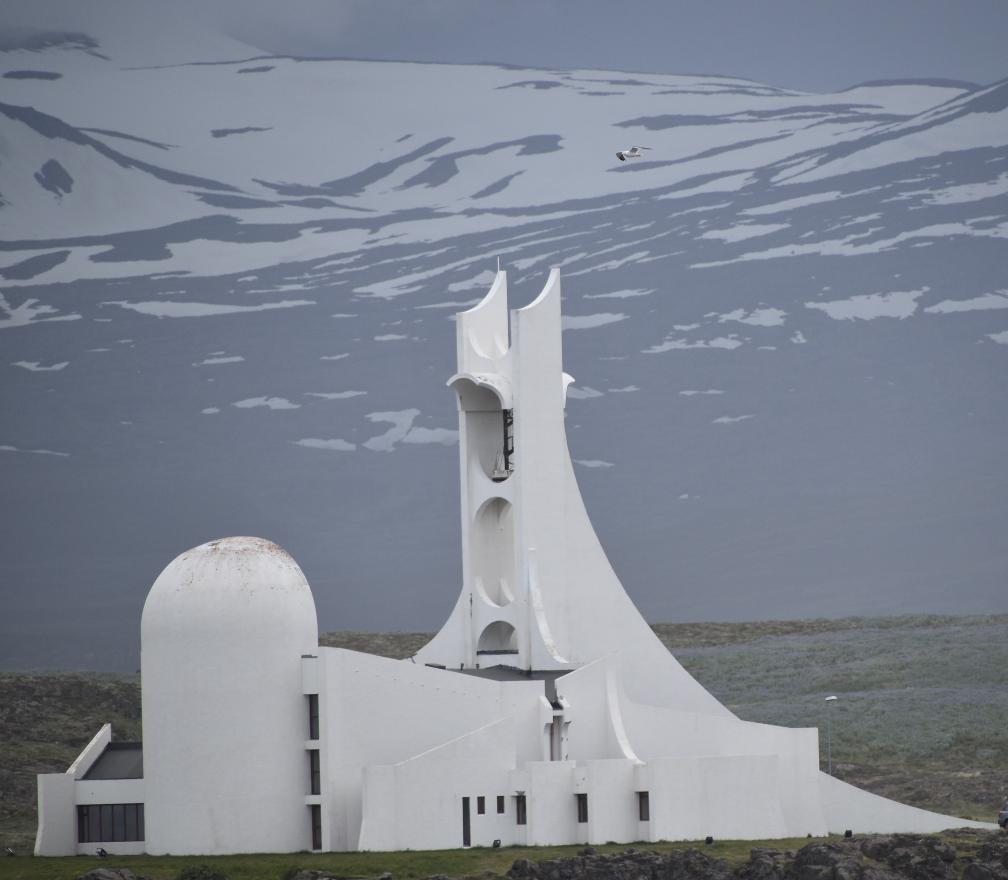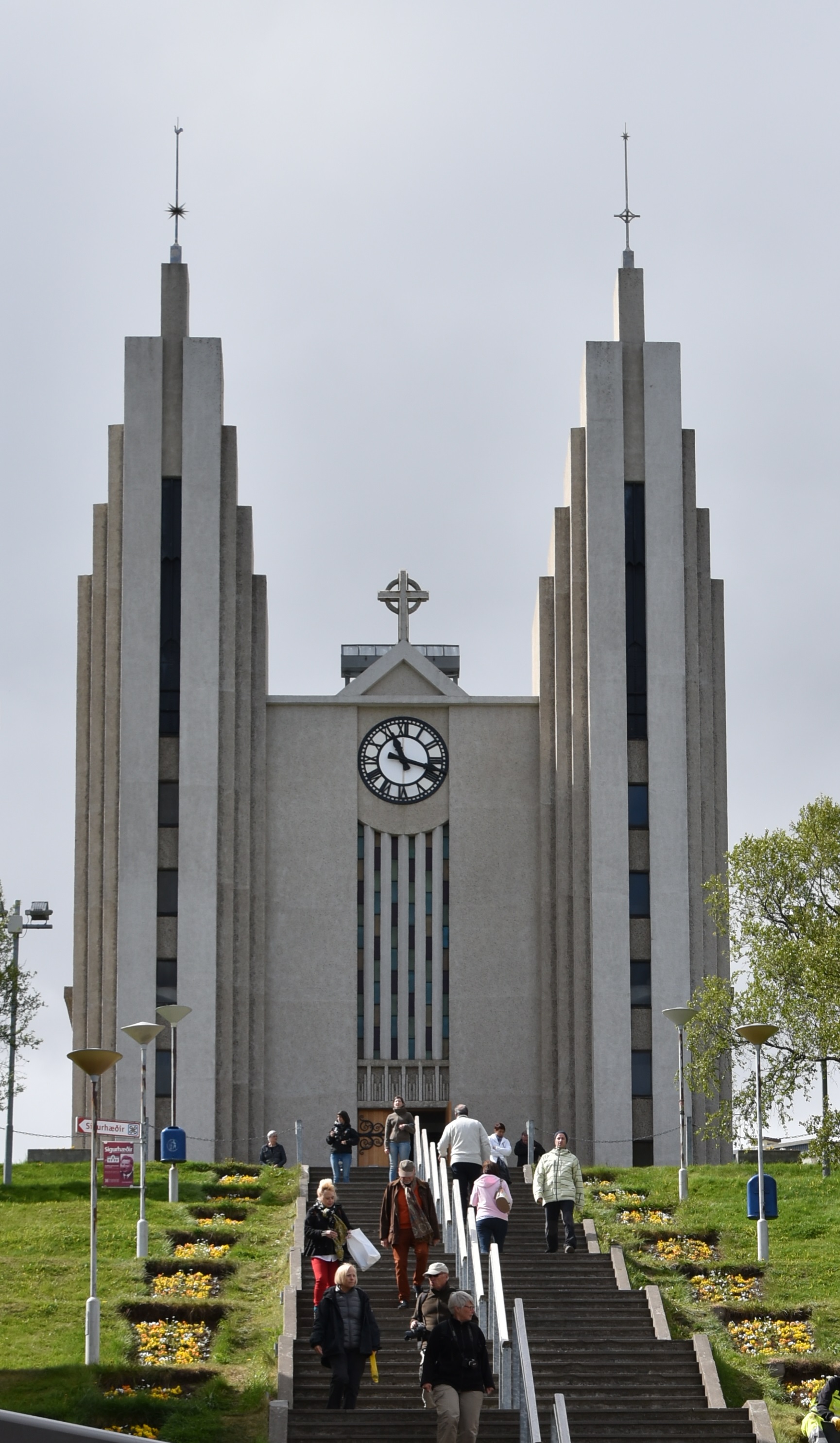 V Akureyriju se do cerkve povzpneš po strmem stopnišču, obsajenem z rožami. V cerkvi izpod stropa visi ladja, ki varuje vse ljudi na morju.